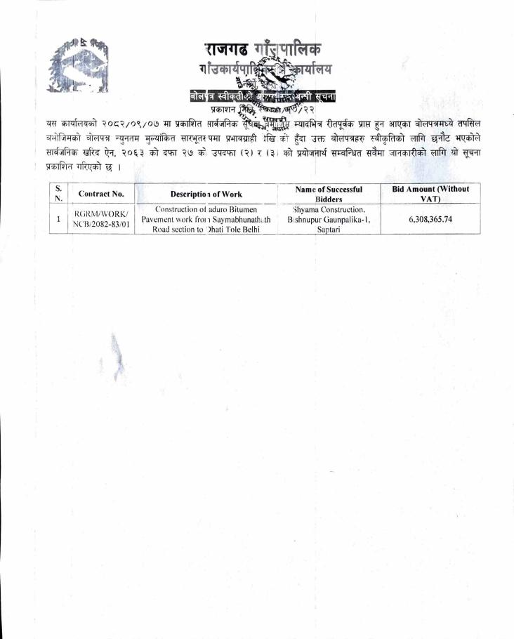 बोलपत्र स्वीकृतीको आसय सम्वन्धी सूचना।