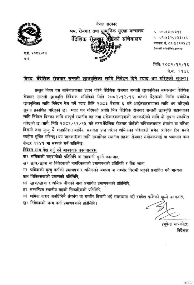 वैदेशिक रोजगार सन्तती छात्रवृत्तिका लागि निवेदन दिने म्याद थप सम्वन्धमा।