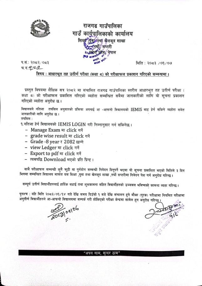 » आधारभूत तह उत्तिर्ण परिक्षा (कक्षा -८) को परिक्षाफल प्रकाशन गरिएको सम्वन्धमा।