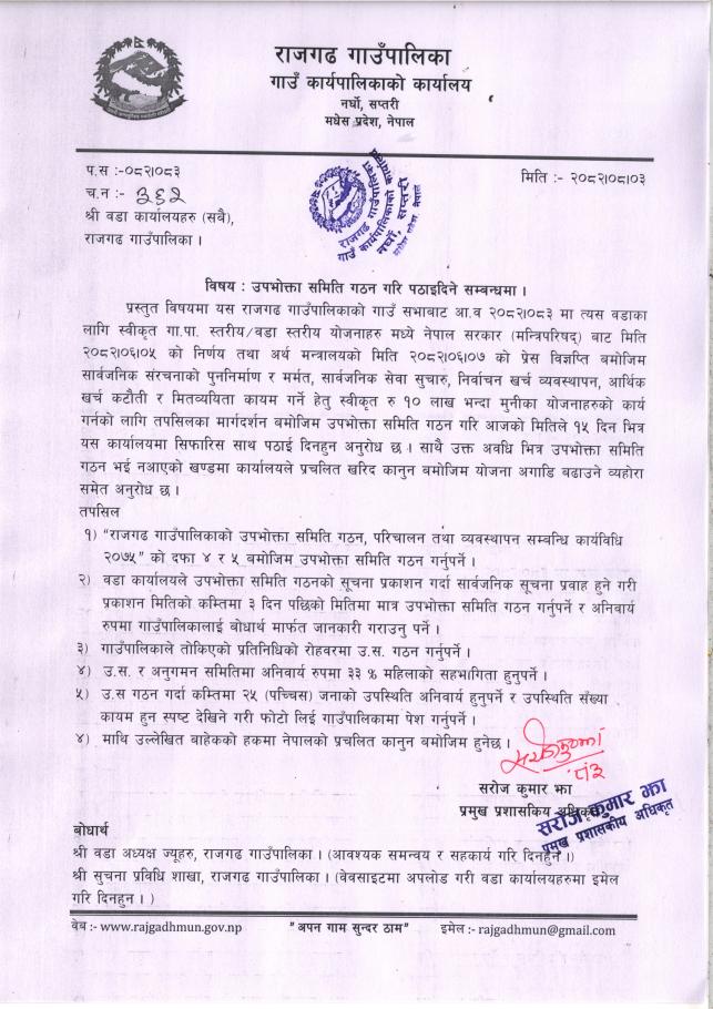 » उपभोक्ता समिति गठन गरि पठाइदिने सम्वन्धमा।
