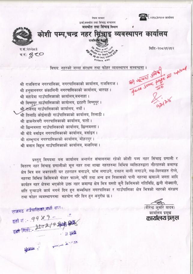 कोशी पम्प नहर सिंचाइ प्रणाली र वितरण नहर सिंचाइ प्रणाली सम्वन्धी अत्यन्त जरुरी सूचना।
