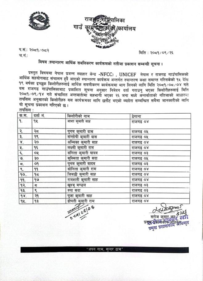 रुपान्तरण आर्थिक सबलिकरण कार्यक्रमको नतिजा प्रकाशन सम्बन्धी सूचना